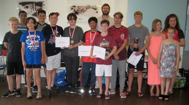 West London Penguin U15s Team Award; Coach Shaun with Murali, Jenson, Sam, Matthew, Alfie, Lucas, Hadi, Alex Rothwell, Joel, Oliver, Lize, Thalia and Órlaith